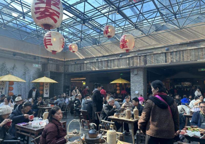 市集另一侧的古风茶馆,则为热闹增添了一份从容。木质桌椅间,三五好友围坐品茶,舞台上不时上演变脸、古筝表演。茶香与市声交织,让这里从单一的消费场所,延展为可停留、可交流的公共空间。银发族在这里寻找旧日记忆,年轻人则把它当作社交新去处。