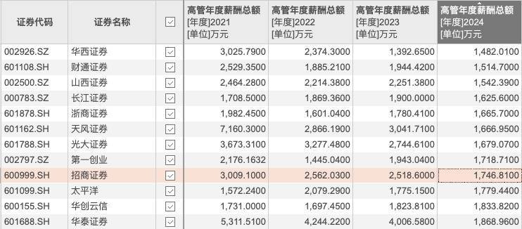 其次,招商证券的高管薪酬也呈现下降趋势。年报数据显示,招商证券董监高薪酬从2021年的3009.10万元降至2024年的1746.81万元。2025年上半年,该公司关键管理人员报酬为498.19万元,较上年同期的783.72万元下降了36.43%。