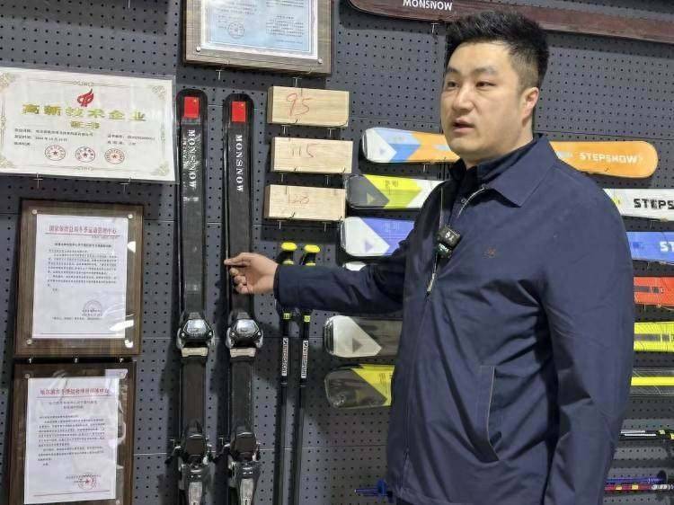 哈尔滨乾卯雪龙体育用品有限公司总经理李智介绍为国家自由式空中技巧滑雪国家队研发专用的训练滑雪板。上游新闻记者 沈度 摄